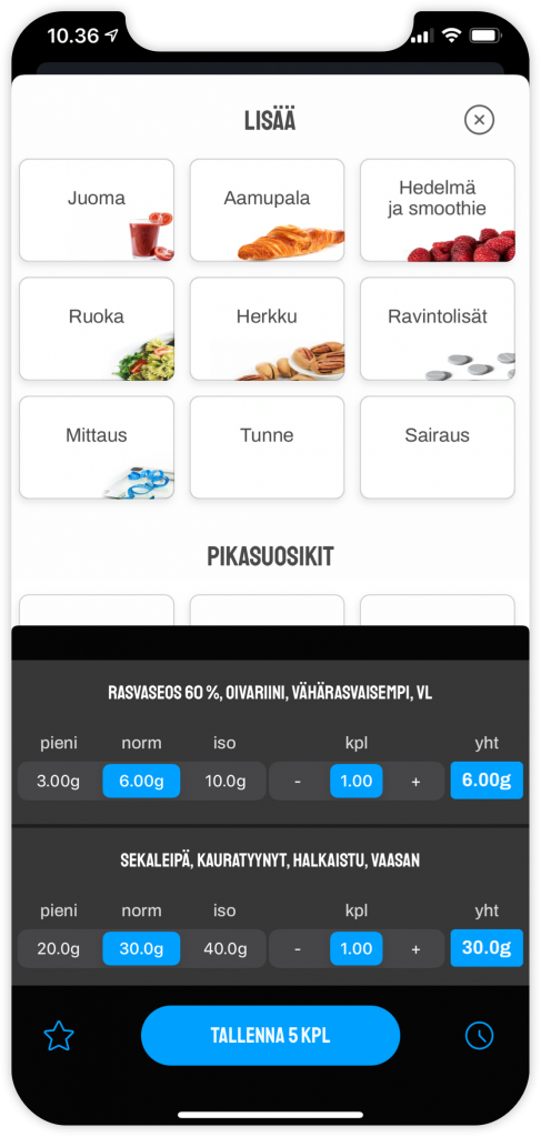 Aterian kirjaus jopa yhdellä painalluksella. Pääset vauhtiin ilman muista sovelluksista tuttua työlästä hakua ja grammojen syöttämistä.